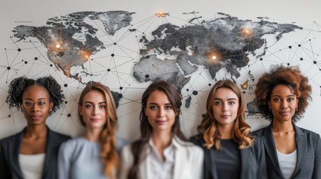 Portrait of a group of women with different nationalities on the world map