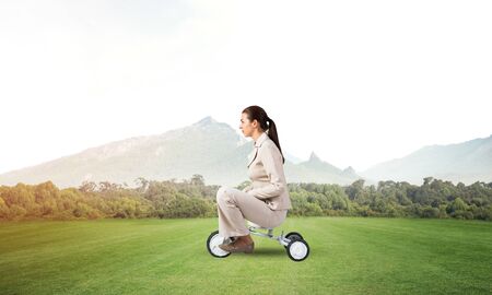 Beautiful young woman riding childrens bicycle on green grass. Businesslady in white business suit cycling small bike outdoor. Professional career start concept. Beginner level metaphor.