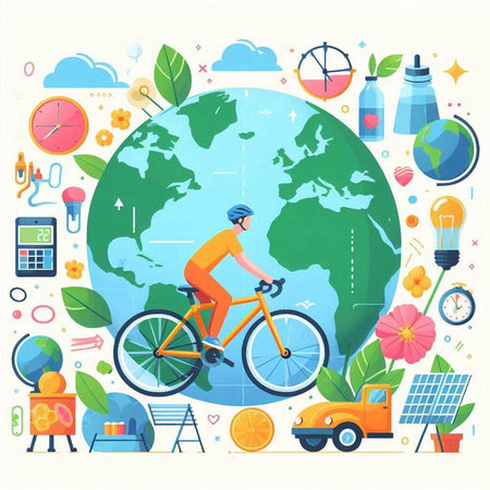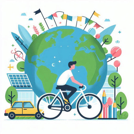 Vector illustration of man riding a bicycle on the background of the globe, solar panels, rocket, car. Eco-friendly concept.
