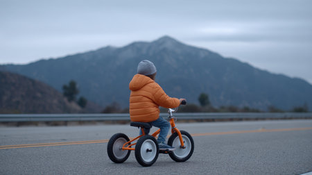 A young child rides an orange tricycle along an empty road, with stunning mountains in the backdrop under a cloudy sky, capturing the essence of adventure.