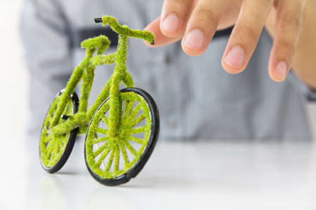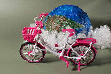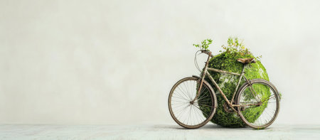 Bicycle with a globe and clouds on a green background. The concept of ecology.