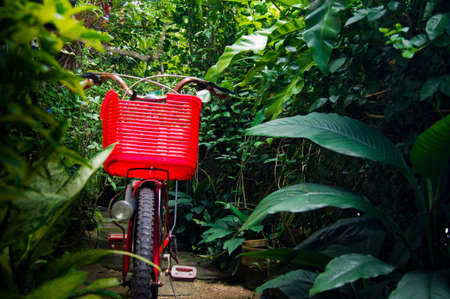 An abandoned red bicycle wheel lies on a lush green background, surrounded by vibrant grass and plants. A serene scene evoking nature's beauty.