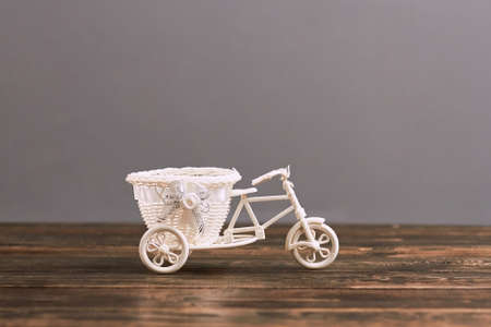 Small tricycle flower basket. Plastic toy on wooden surface. Vintage toys for sale.