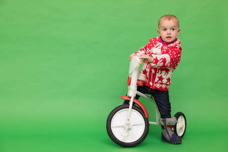Teddy bear wearing Christmas costume sitting on vintage tricycle. Xmas holiday concept