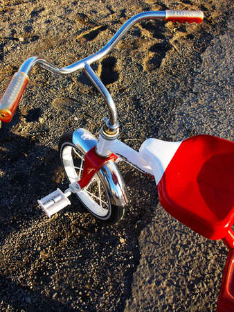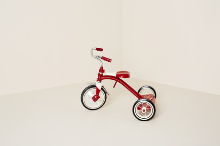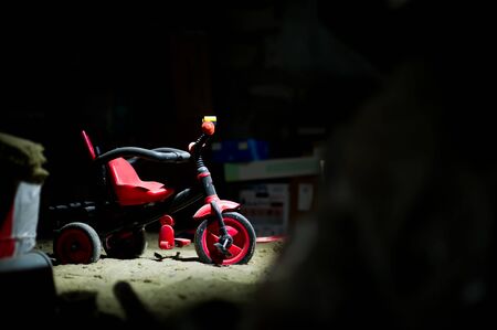 an abandoned childrens bike dusting in the attic among the old trash. The concept of forgotten childhood. Copy space
