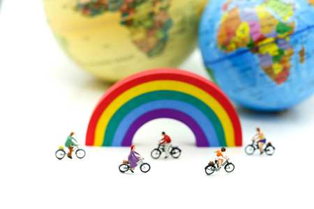 Miniature people : Travelers riding bicycle on rainbow with world map,travel concept.