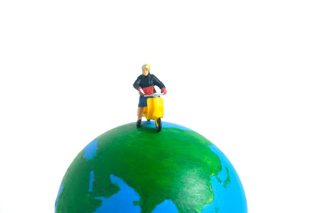 Miniature people toys conceptual photography. Global, international delivery service. Postman, courier standing above earth globe.