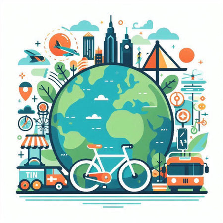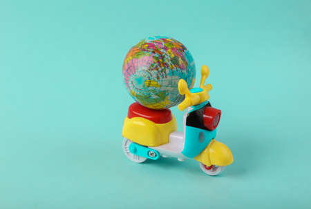 Travel and transport concept. Globe, bicycle, car, bike, scooter, bus, train. Vector illustration in flat style