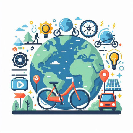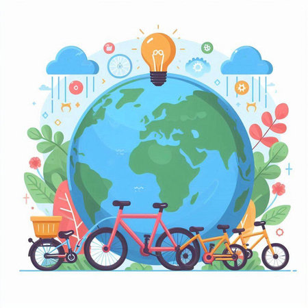 Ecology concept. Vector flat design illustration of bicycle, solar panel, globe, wind turbine, car, solar cell, car, bicycle, map.