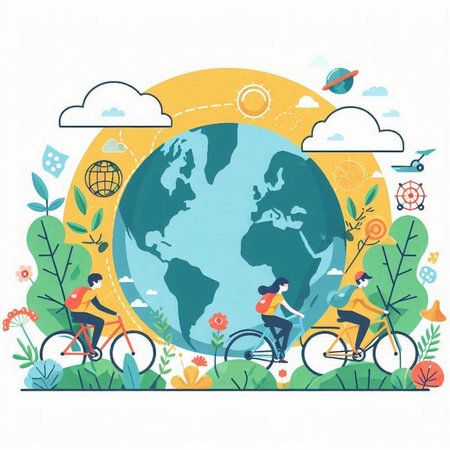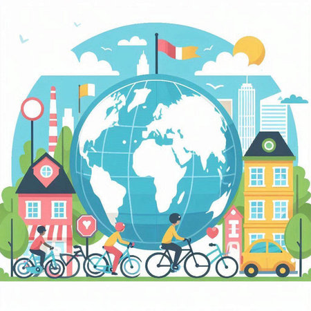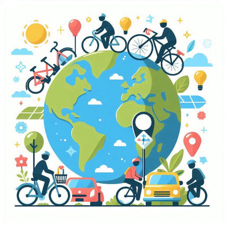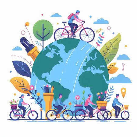 Vector illustration of people riding bicycle around the world. Ecological concept.