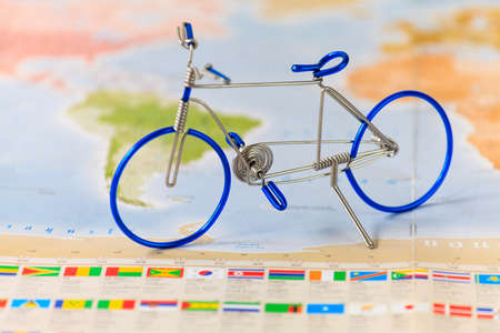 Miniature people : riding bicycle with world map,Sport, Travel and business concept.