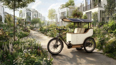 Eco-friendly solar-powered tricycle amidst lush green urban landscape.