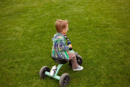 Small yellow and green children's tricycle standing on the grass on a sunny day. Copy space