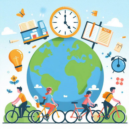 Flat design vector illustration concept of traveling around the world. People riding bikes, bicycle, backpack, clock, globe, books, pencils, alarm clock.