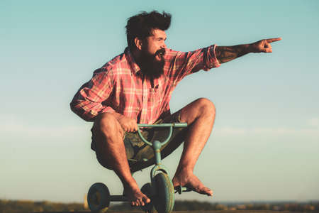 Funny man on a bicycle. Emotional crazy guy on a childrens bike.