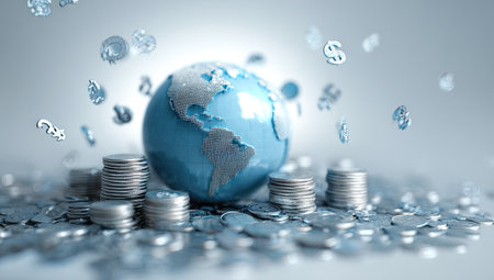An image features a globe surrounded by stacks of coins and various currency symbols. The composition utilizes a soft, cool color palette with shades of blue and silver, creating a sense of depth. This visual concept represents international finance and global market trends, suitable for editorial and commercial applications.