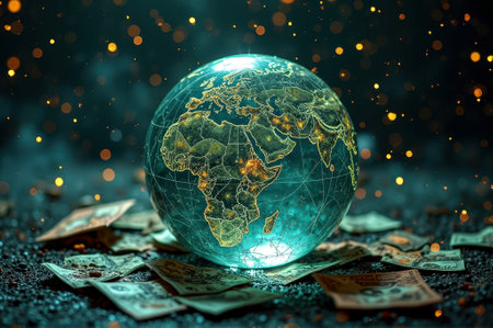 That the image is generated using AI. Illuminated transparent globe on currency notes with sparkling bokeh background.