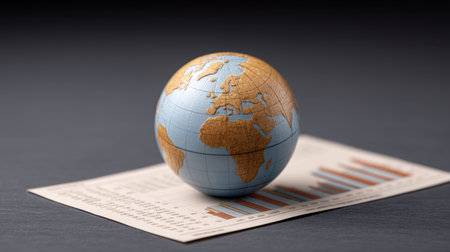 A world globe positioned on a financial chart showcases the relationship between global geography and business data. Ideal for themes of economy and analysis.