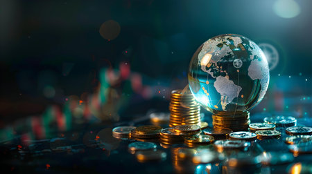 A detailed globe rests on a stack of coins, symbolizing finance and global economy. The background features a financial chart, representing market trends.