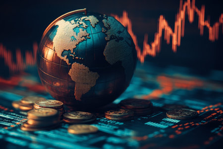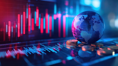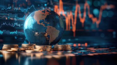 This image illustrates a global financial concept featuring a globe, currency coins, and a digital stock market chart, symbolizing economic interconnection and investment potential.