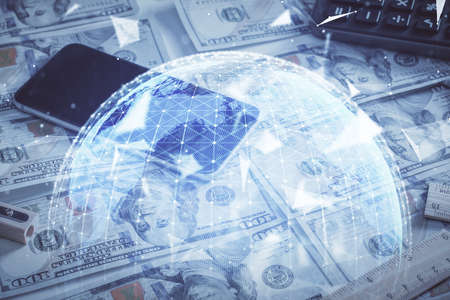 Multi exposure of business theme drawing over us dollars bill background. Concept of financial success.