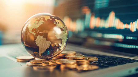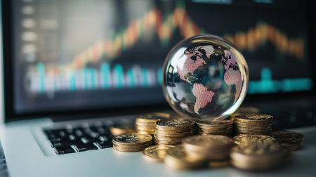 A striking visual of a glass globe on a heap of coins, set against a laptop displaying financial graphs, representing economic growth and global finance trends.