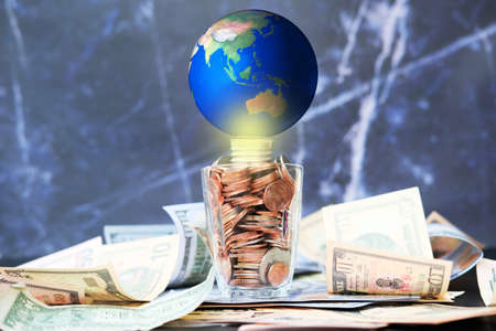 The display features a collection of cash notes alongside coins and a small globe. This setup highlights the interconnectedness of global finance and economic activities.
