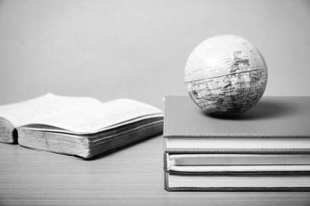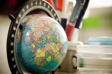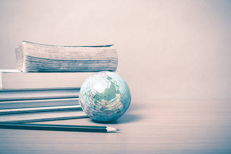 Earth globe model ball map with class room background. Concept for global international educaiton or communications, politics environmental for learning world wide. vintage tone