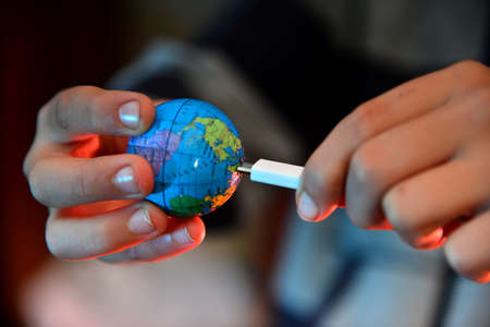 A man is trying to charge the planet earth from the network, through a white cable on a red background. The concept of saving the planet