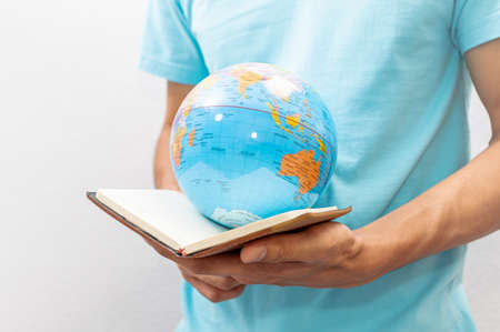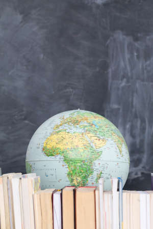 Globe and open books on a bright, neutral background. Education, travel, learning.