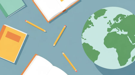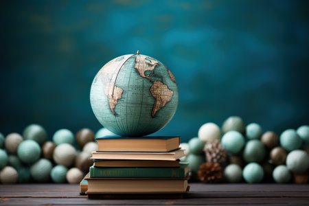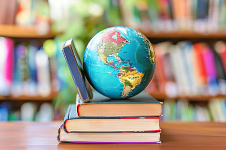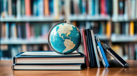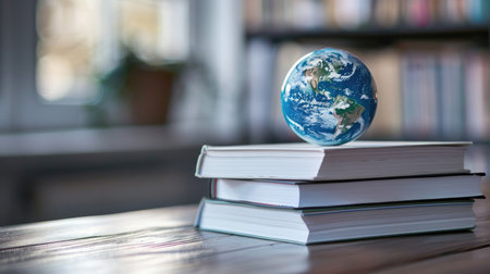 A globe is positioned on a table beside a pile of books, embodying elements of the world, reading, and knowledge through this visual composition