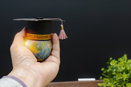 Educational success concept. Education will increase knowledge, And it will have value for life. The globe is placed on the hand and worn with a graduation cap. The background is a blackboard.