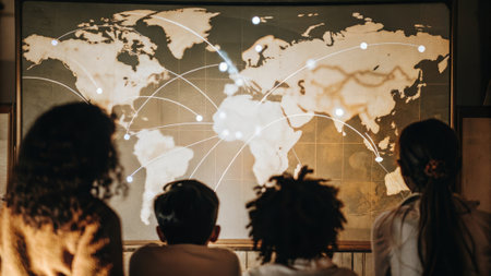 A medium closeup featuring a holographic map of global locations with animated connections between them while a diverse audience examines the projections intently..