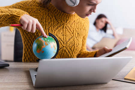 teenage girl in wireless headphones pointing at globe while looking at notebook near blurred mother on background