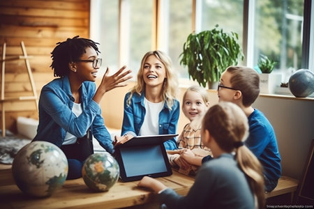 Generative AI : Woman in glasses and positive children examining globe while standing around table in geography classroom during lesson at school