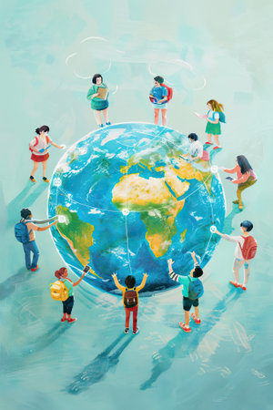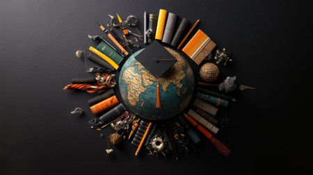 A vibrant arrangement of colorful books encircles a globe, symbolizing the quest for knowledge and global understanding. Ideal for educational themes.