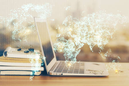 Computer on desktop with social network theme icon. Multi exposure. Concept of international connections.
