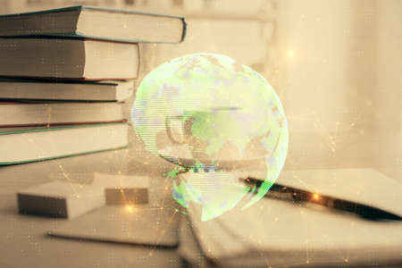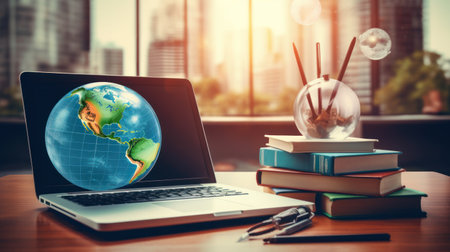 This image depicts a workspace with a laptop displaying a holographic globe, surrounded by various technological elements and an array of books. The holographic globe is central, indicating a focus on global connectivity and technology. The laptop screen shows interconnected networks and data streams, symbolizing digital integration. The presence of books suggests a blend of traditional learning with modern technology.