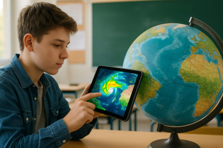 Teen student using a tablet to study weather patterns next to a globe in a classroom setting, highlighting education and technology integration