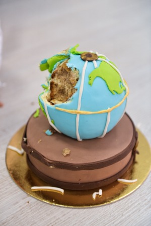 childrens themed birthday travel. smash the cake. sweet globe on a suitcase