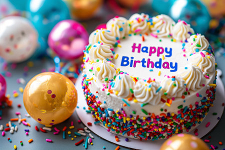 Happy Birthday card with konfetti and a cake. Generative AI