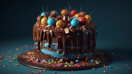 Exquisitely designed colorful birthday cake adorned with vibrant sweets, a luscious chocolate drizzle, and set against a blue background. AD artistic creation perfect for celebrations, parties,