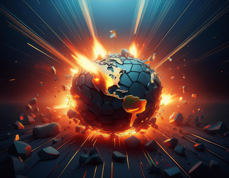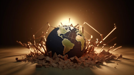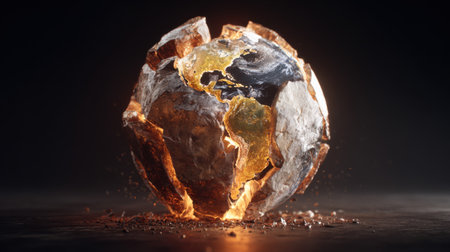 An artistic depiction of a cracked globe reveals its illuminated interior, surrounded by debris in a dark setting, symbolizing the fragility of our planet.