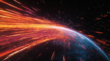 A stunning depiction of cosmic acceleration features vibrant streaks of light and energy over a planet's surface, representing the beauty of space travel and exploration.