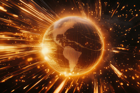 A globe rotates energetically with glowing contour lines, reflecting global interconnectivity and vibrant energy during a digital age.