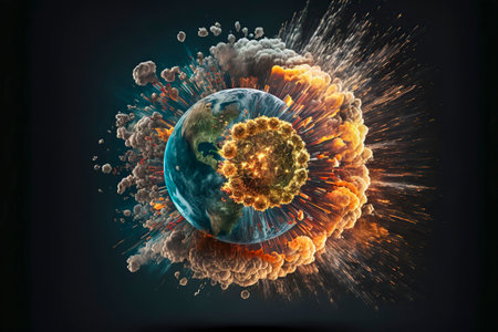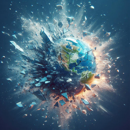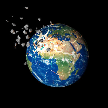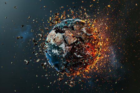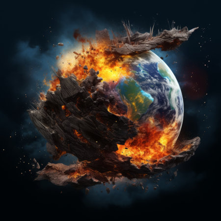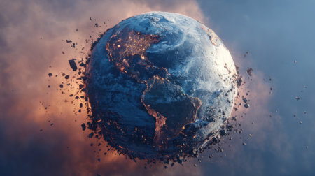 An artistic portrayal of Earth experiencing destruction, with flying rocks and a dramatic backdrop capturing the chaotic beauty of a cosmic event.