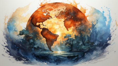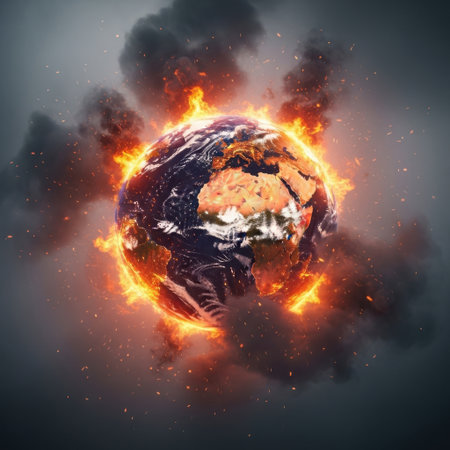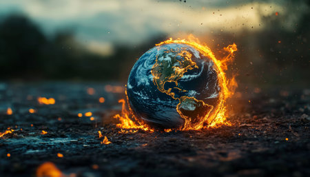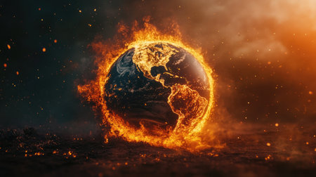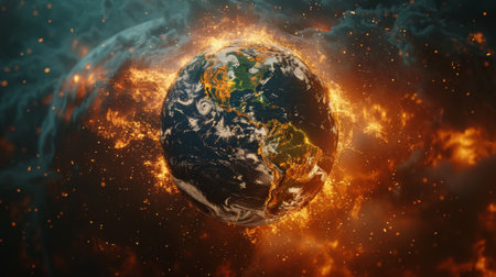 This captivating image showcases a fiery earth, symbolizing the urgent environmental challenges and the need for global awareness and transformation.
