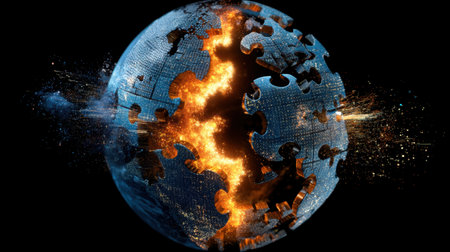 A captivating image of a puzzle sphere surrounded by dynamic sparks, evoking themes of complexity and global connectivity set against a dark backdrop.