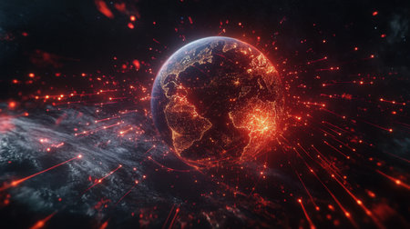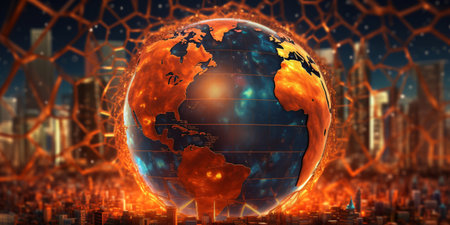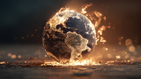 This captivating image depicts a fiery representation of Earth, showcasing global connections while highlighting environmental challenges and crises.