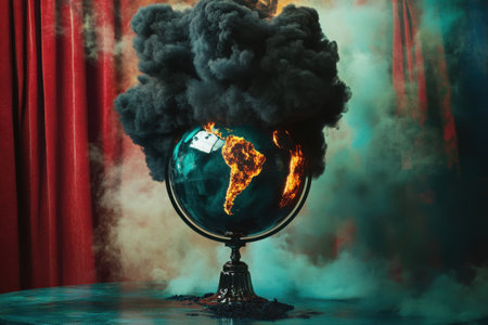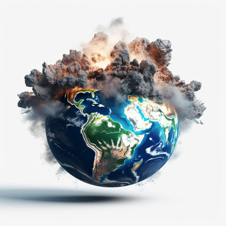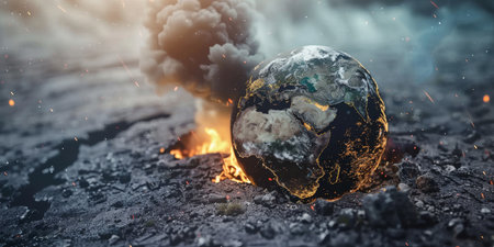 A globe, engulfed in smoke and debris, symbolizes the devastating consequences of an environmental catastrophe on our planet.